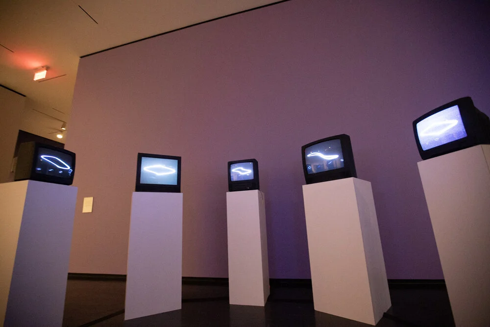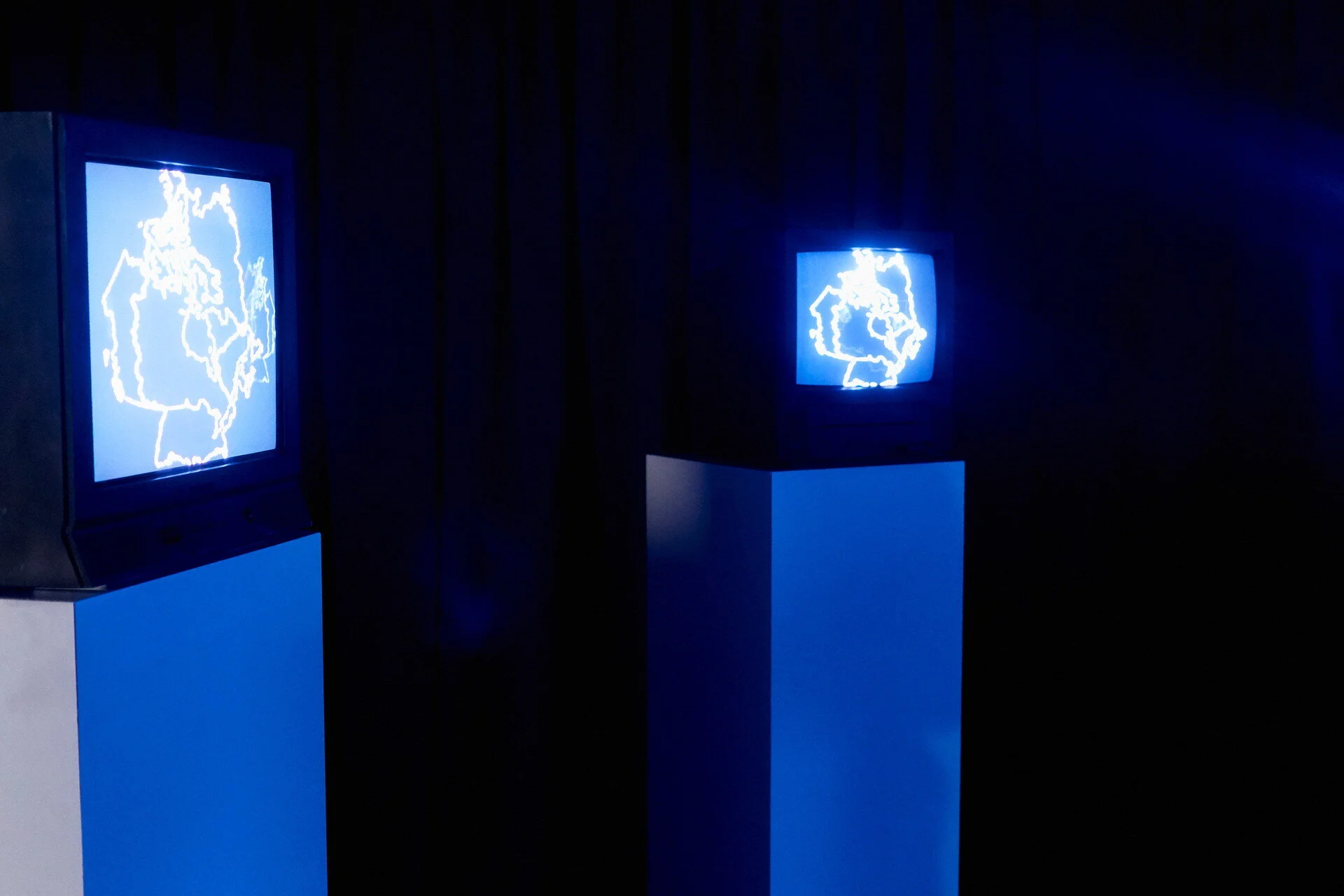 Eight CRT televisions encircle the viewer, surrounding them with oscillating sound and light that is equally hypnotic and jarring. The content on each screen is created by ‘hacking’ the television - interrupting the electrical signal that normally creates the image, and replacing it with signals generated from an analog modular synthesizer and real-time computer program. By disrupting the normal flow of the signal and injecting her own electrical performance into the system, Anzola aims to subvert traditional concepts of borders, opening them to reinterpretation and alternative points of view.